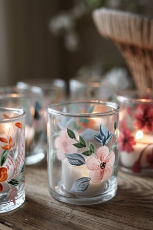 Handmålade blommor i livfulla färger ger denna värmeljushållare en unik och levande karaktär. Varje exemplar är ett litet hantverk som sprider värme och stämning – lika vacker på egen hand som en färgstark och personlig detalj i ditt hem. | Från IB Laursen