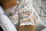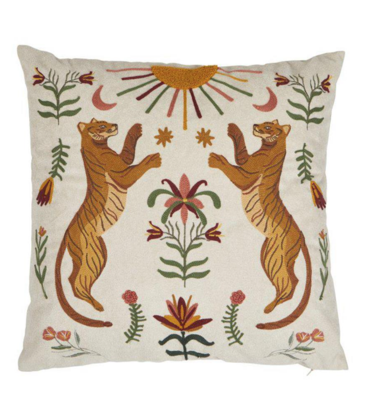 Mönstrat kuddfodral med en enfärgad botten och detaljrikt mönster i mustiga färger. Mönstret, i brodyr, tillför en rustik känsla till hemmet. Baksidan är enfärgad. | Från Fondaco