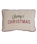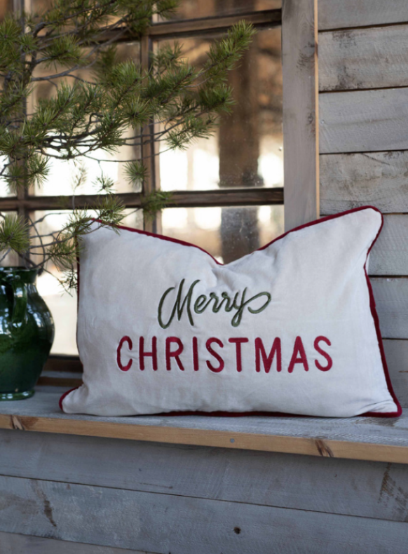 Underbart kuddfodral i julig anda med sammetskänsla, broderad text och dekorativ röd passpoal runt om | Från Fondaco