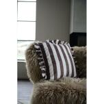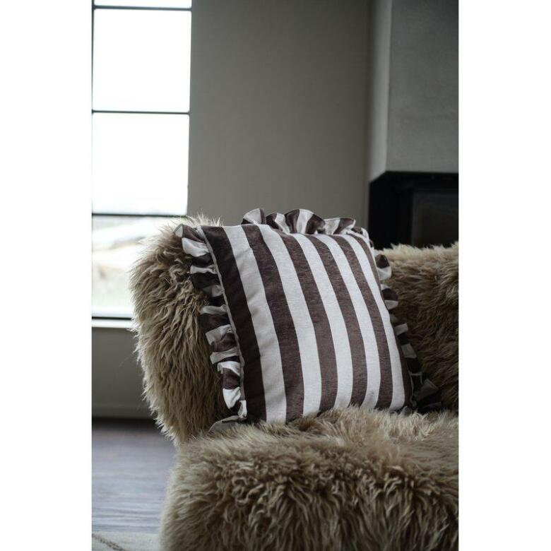 Randigt kuddfodral med sammetseffekt, som kombinerar elegans och mjukhet på ett stilfullt sätt. Kuddfodralets vackra lyster fångar ljuset och ger rummet en varm och inbjudande känsla. Det är även dekorerat med en volang runtom, vilket tillför en romantisk och dekorativ touch. | Från Fondaco
