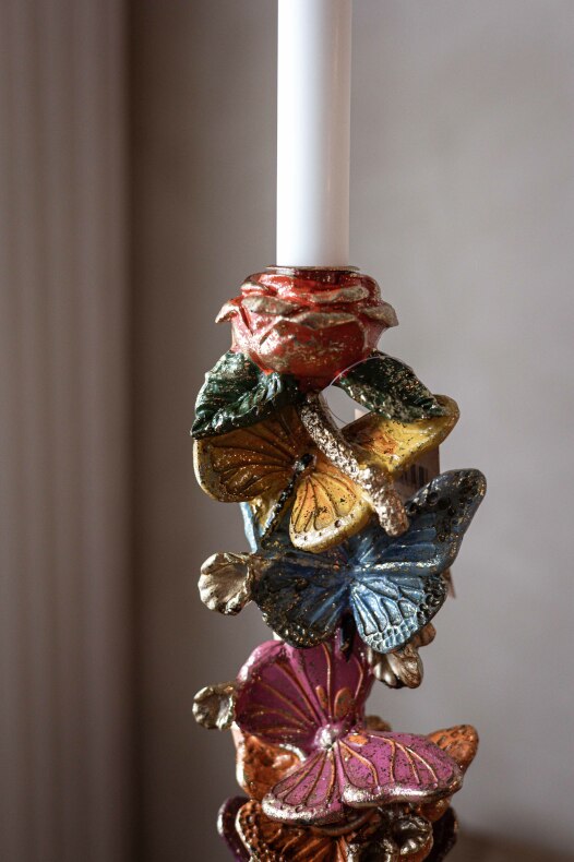 nred med levande ljus med en fin ljusstake dekorerad med fjärilar | Från A Lot Decoration