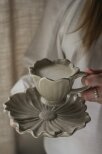 Matcha med muggar och ljusstakar samt söta skålar i samma blommande känsla.