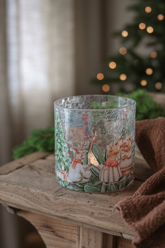 Finish Handgjord krackelerad glaslykta med mönster av julens sötaste djur i sann jul anda