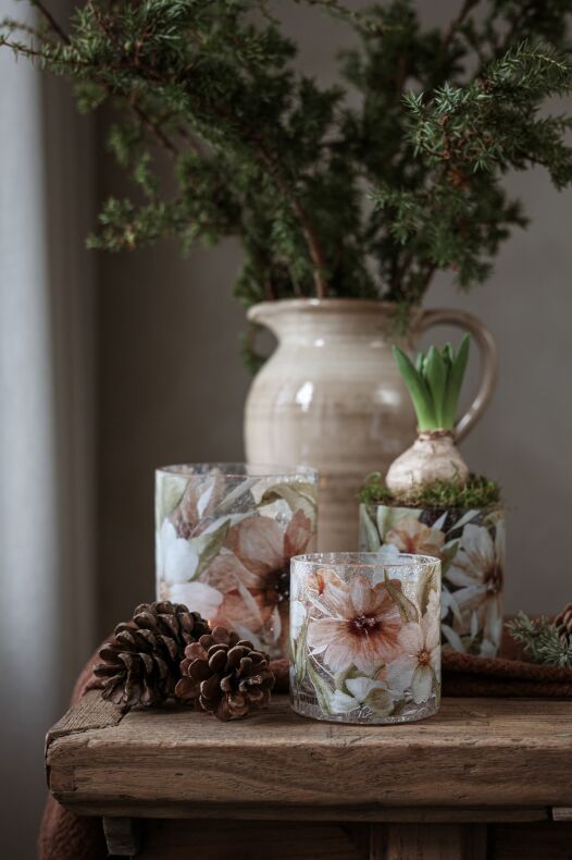 Finish Handgjord krackelerad glaslykta med mönster av vackra blommor och blad i naturens toner