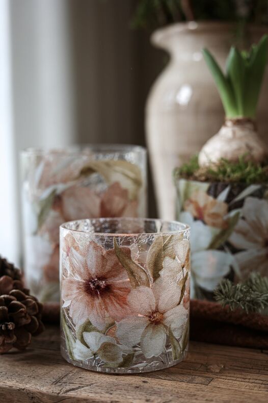 Finish Handgjord krackelerad glaslykta med mönster av vackra blommor och blad i naturens toner