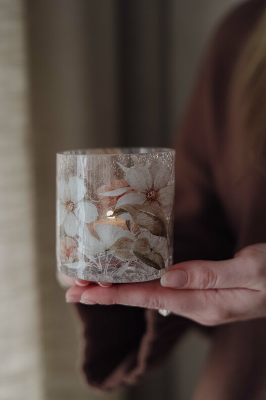 Finish Handgjord krackelerad glaslykta med mönster av vackra blommor och blad i naturens toner