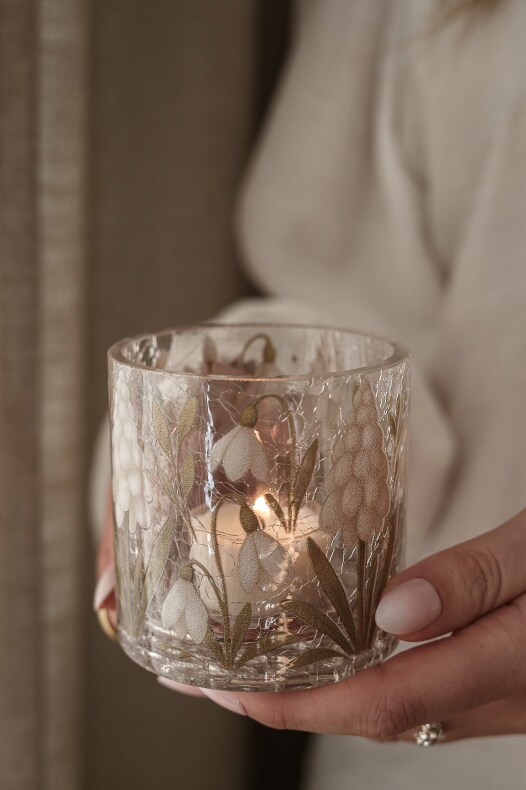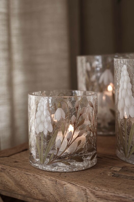 Finish Handgjord krackelerad glaslykta med mönster av vackra Pärlhyacinter, videkvistar och snöklockor.