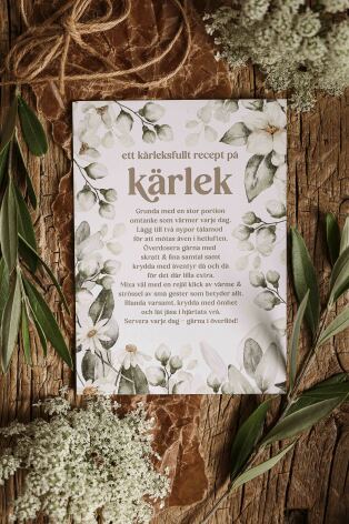 Text: Ett kärleksfullt recept på kärlek. Grunda med en stor portion omtanke som värmer varje dag. Lägg till två nypor tålamod för att mötas även i hetluften. Överdosera gärna med skratt & fina samtal samt krydda med äventyr då och då för det där lilla extra. Mixa väl med en rejäl klick av värme & strössel av små gester som betyder allt. Blanda varsamt, krydda med ömhet och låt jäsa i hjärtats vrå. Servera varje dag - gärna i överflöd!