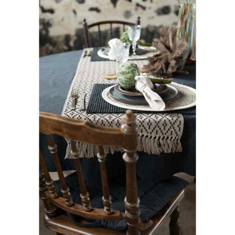 Stilren löpare med grov struktur, där de söta fransarna möter det robusta. Ger en rustik och modern känsla till din dukning.