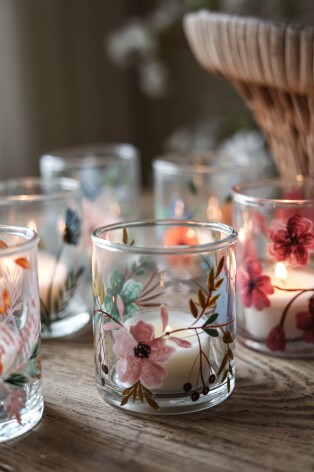Handmålade blommor i livfulla färger ger denna värmeljushållare en unik och levande karaktär. Varje exemplar är ett litet hantverk som sprider värme och stämning – lika vacker på egen hand som en färgstark och personlig detalj i ditt hem. | Från IB Laursen