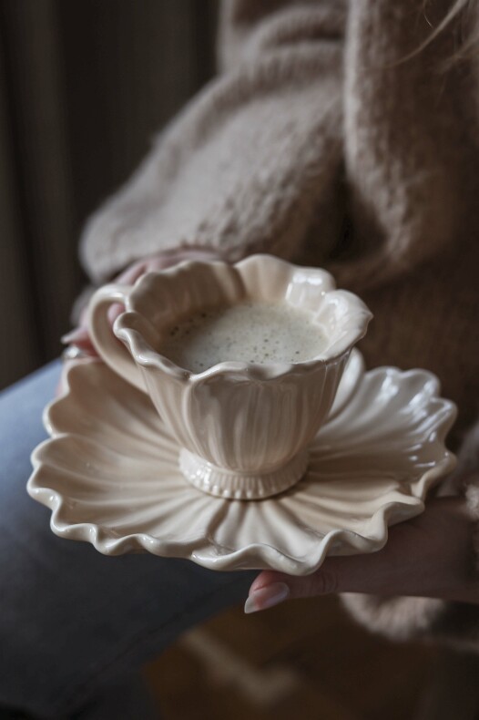 Matcha med muggar och ljusstakar samt söta skålar i samma blommande känsla.