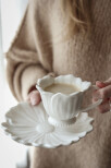 Matcha med muggar och ljusstakar samt söta skålar i samma blommande känsla.