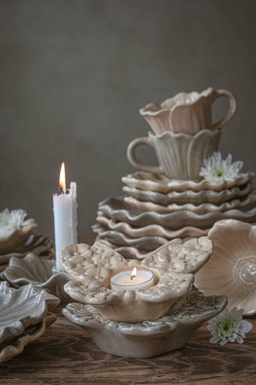 Matcha med muggar, skålar, söta fat samt ljusstakar i samma blommande känsla.
