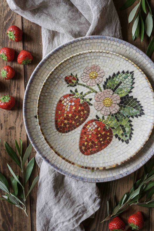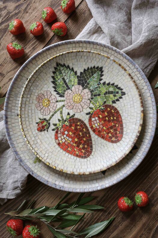 Hållbart stengods med vackert mosaikmönster av jordgubbar.