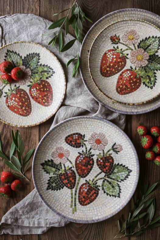 Hållbart stengods med vackert mosaikmönster av jordgubbar.