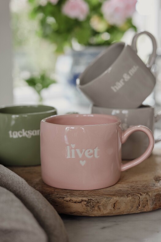 Ljuvlig mugg med organisk handgjord känsla och silkscreen text i keramiken.