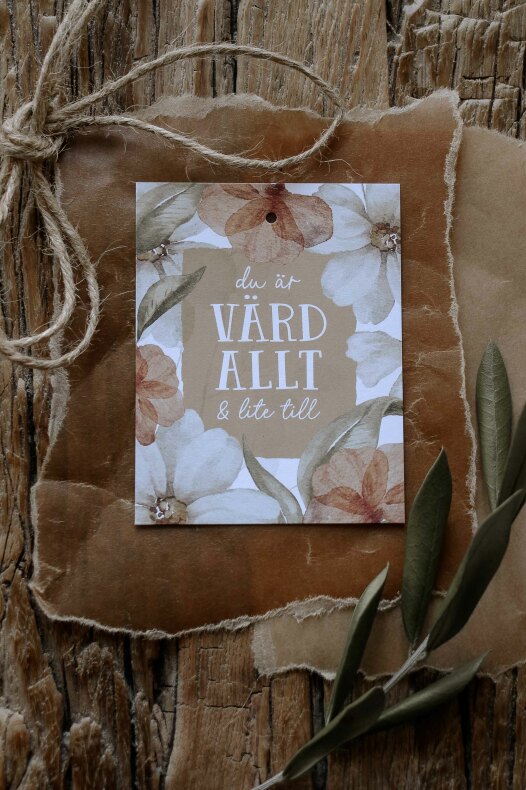 Strl 7 x 9 cm | 200 grams obestruket papper med hål för snöre & band