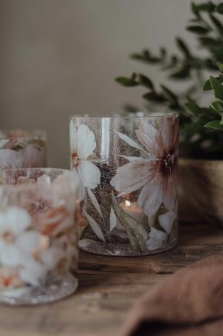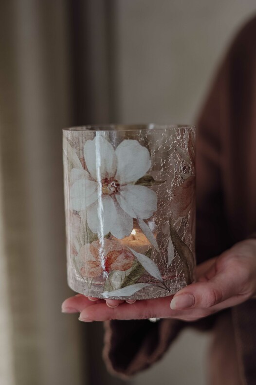 Finish Handgjord krackelerad glaslykta med mönster av vackra blommor och blad i naturens toner
