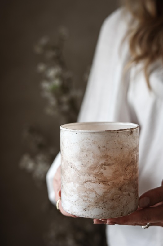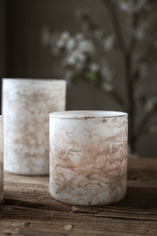 Finish Handgjord glaslykta i vacker vit/sand/grå finish med levande mönstring