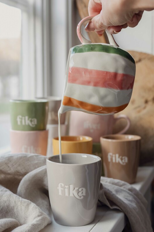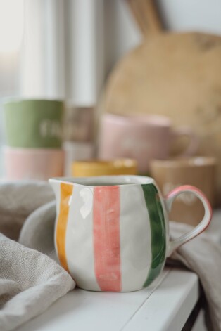 Härlig mjölkkannan med organisk levande känsla i keramiken, handmålade ränder runt om i glada färger
