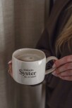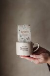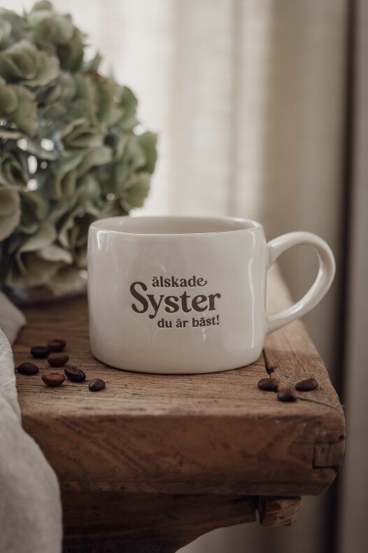 Ljuvlig mugg med organisk handgjord känsla och silkscreen text i keramiken.
