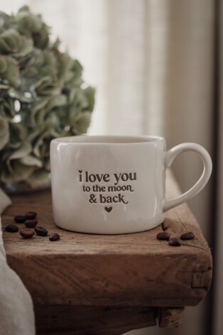 Ljuvlig mugg med organisk handgjord känsla och silkscreen text i keramiken.