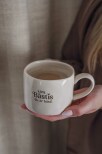 Ljuvlig mugg med organisk handgjord känsla och silkscreen text i keramiken.