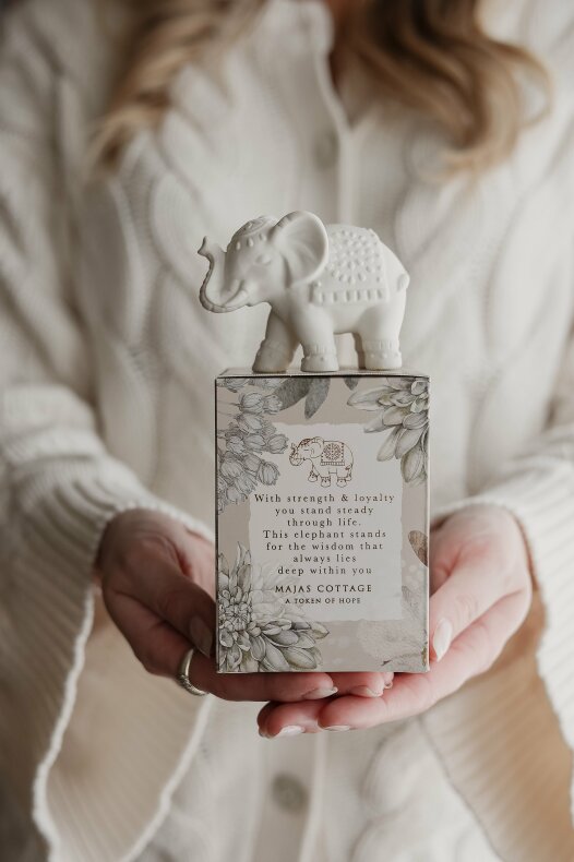 Text: Med elefantens styrka & lojalitet står du stadigt genom livets utmaningar. Glöm inte att visdomen alltid finns djupt inom dig. / With strength & loyalty you stand steady through life. This elephant stands for wisdom that always lies deep within you.