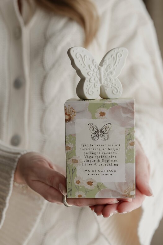 Text: Fjärilar visar oss att förändring är början på något vackert. Våga sprida dina vingar & flyg mot frihet & utveckling. / Butterflies remind us that change is something beautiful. Spread your wings and fly towards freedom & growth.