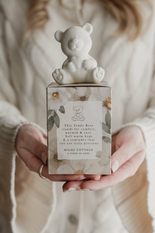 Text: Denna Nalle står för trygghet värme & omtanke. Varma goa kramar & en påminnelse om att Du är guld värd! / This Teddy Bear stands for comfort, warmth & care. Soft warm hugs & a reminder that you are truly precious.
