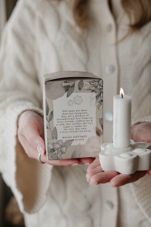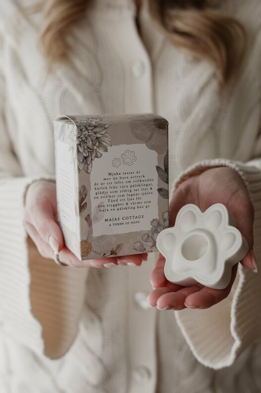 Text: Mjuka tassar är mer än bara avtryck de är ett löfte om villkorslös kärlek från våra pälsklingar, glädje som aldrig tar slut & en stillhet som lugnar själen. Tänd ett ljus för den trygghet & värme som bara en pälskling kan ge. / Soft paws are more than just footprints they are a promise of unconditional love from our furry friends, endless joy & a calm that soothes the soul. Light a candle for the love that only a furry friend can bring.