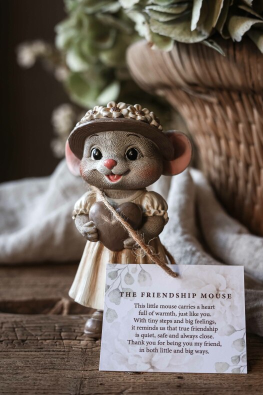 Text: Den här lilla musen har ett hjärtans fyllt av värme precis som du. Med små steg och stora känslor påminner den oss om att riktig vänskap är tyst, trygg och alltid nära. Tack för att du är du min vän, i det lilla och stora / This little mouse carries a heart full of warmth, just like you. With tiny steps and big feelings, it reminds us that true friendship is quiet, safe anf always close. Thank you for being you my friends, in both little and big ways.