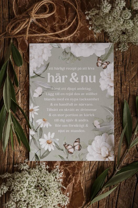 Text: Ett härligt recept på att leva här & nu. Först ett djupt andetag. Lägg till en rejäl dos av stillhet bland med en nypa tacksamhet & en handull av närvaro. Tillsätt en skvätt av drömmar & en stor portion av kärlek till dig själv & andra. Rör om försiktigt & njut av stunden.