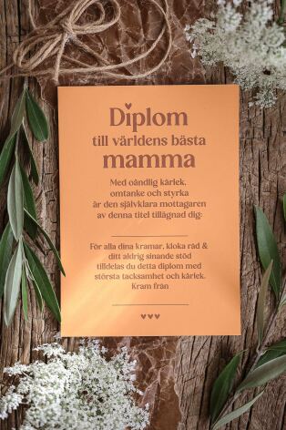 Text: Diplom till världens bästa mamma. Med oändlig kärlek, omtanke & styrka är den självklara mottagen av denna titel tillägnad dig: ___ För alla dina kramar, kloka råd & ditt aldrig sinande stöd tilldelas du detta diplom med största tacksamhet och kärlek. Kram från ___