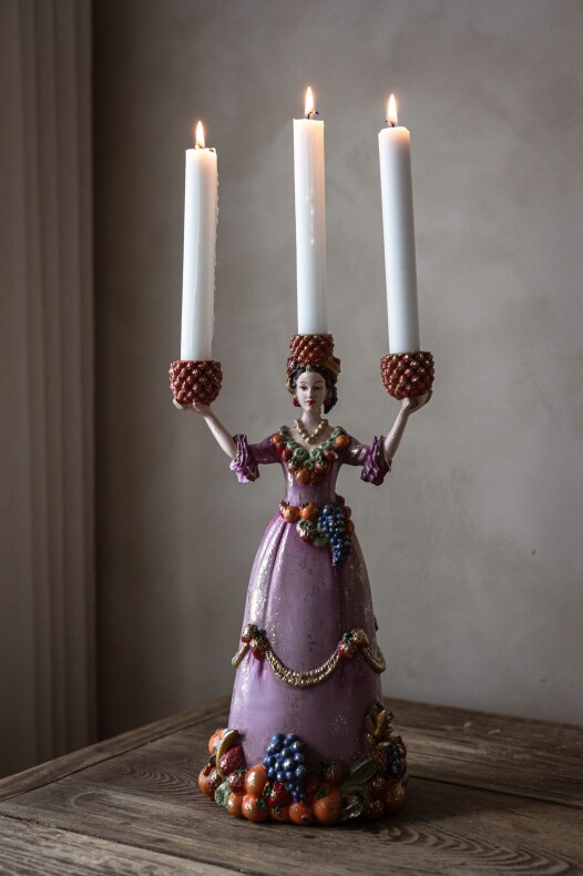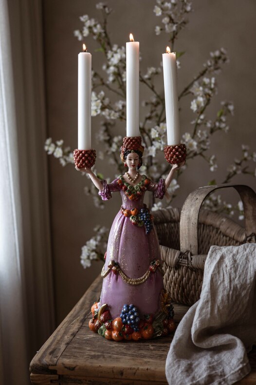 Inred med elegans och lekfullhet med en fin trearmad ljusstake föreställande en kvinna i klänning med olika frukter.| Från A Lot Decoration